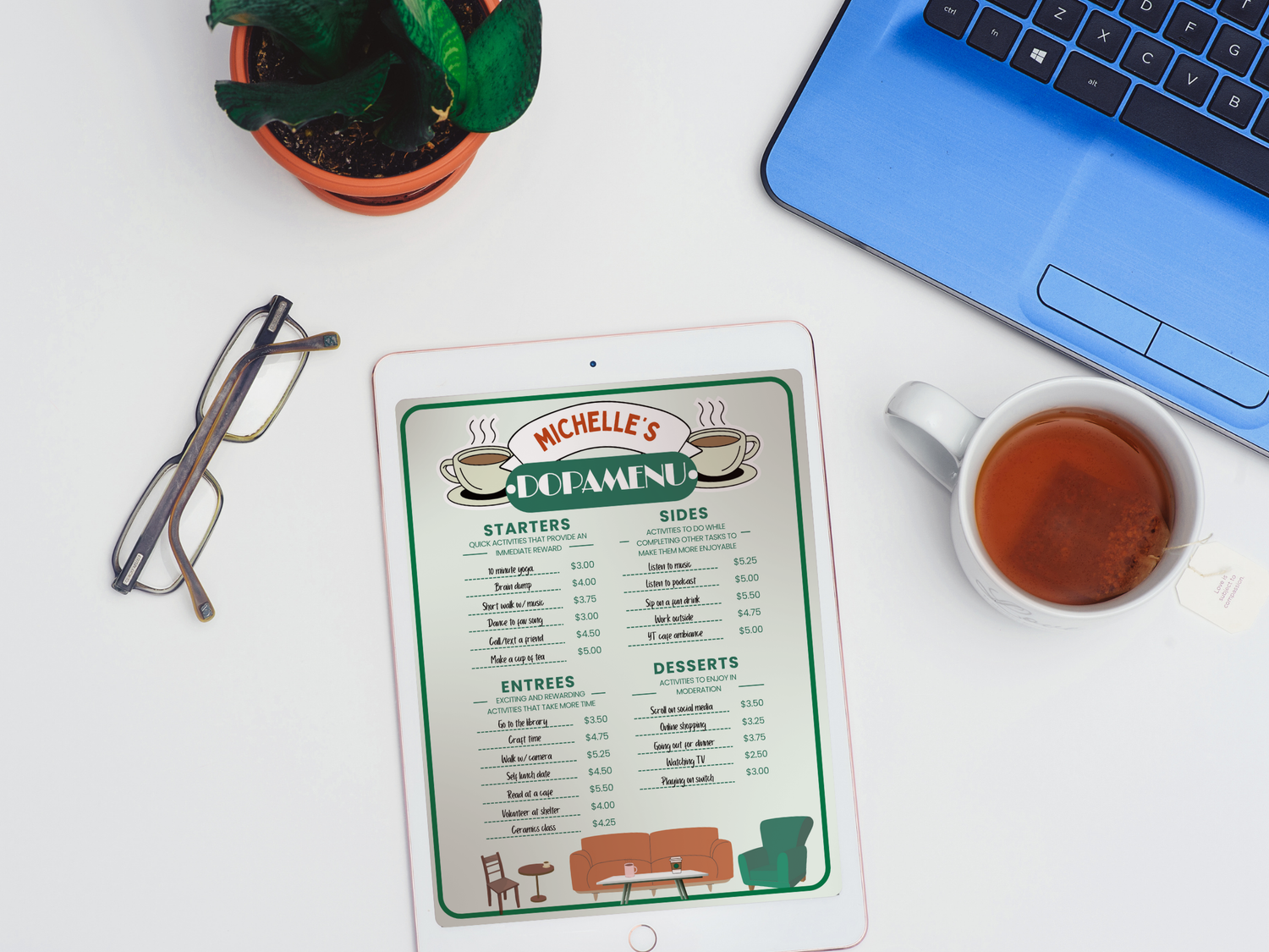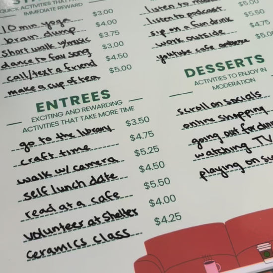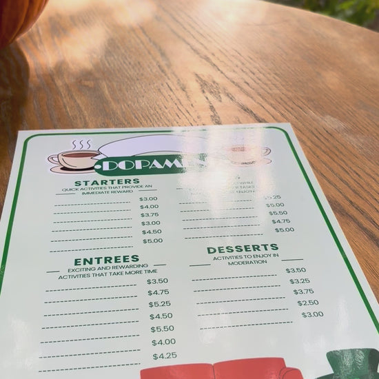 Our restaurant-themed Dopamenu templates allow you to curate your own list of dopamine-rich activities that make getting through your to-do list more manageable, even exciting!